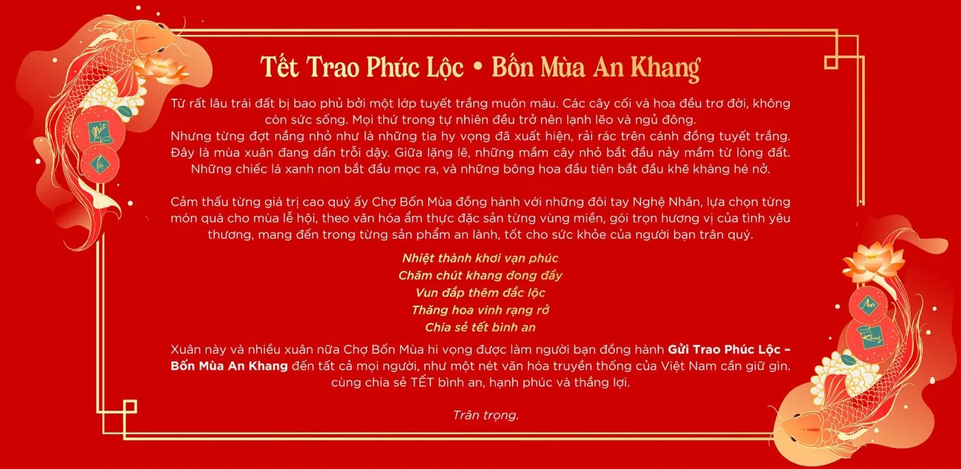 Quý khách có thể dễ dàng tìm kiếm sản phầm chất lượng tại Chợ Bốn Mùa nơi giao thoa, giới thiệu nét văn hóa, Lễ Hội Tết Việt mang lại ẩm thực, đặc sản vùng miền – làng nghề truyền thống việt nam.